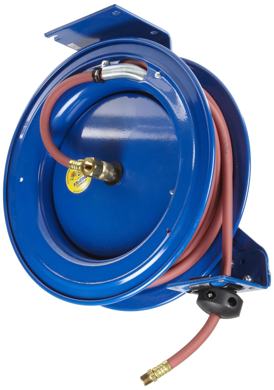 This Coxreels SH-N-350 reel and hose unit for low pressure air or water applications has a cartridge-style spring motor for automatic rewind for non-kinked storage and protection of the hose.